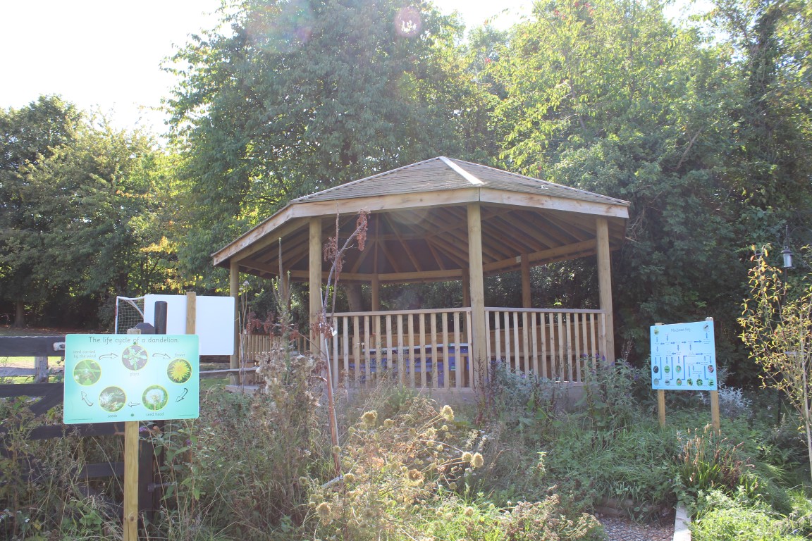 A large octagonal gazebo is complete with integral benches and panels, making it the perfect outdoor classroom to take classes outdoors in nice weather