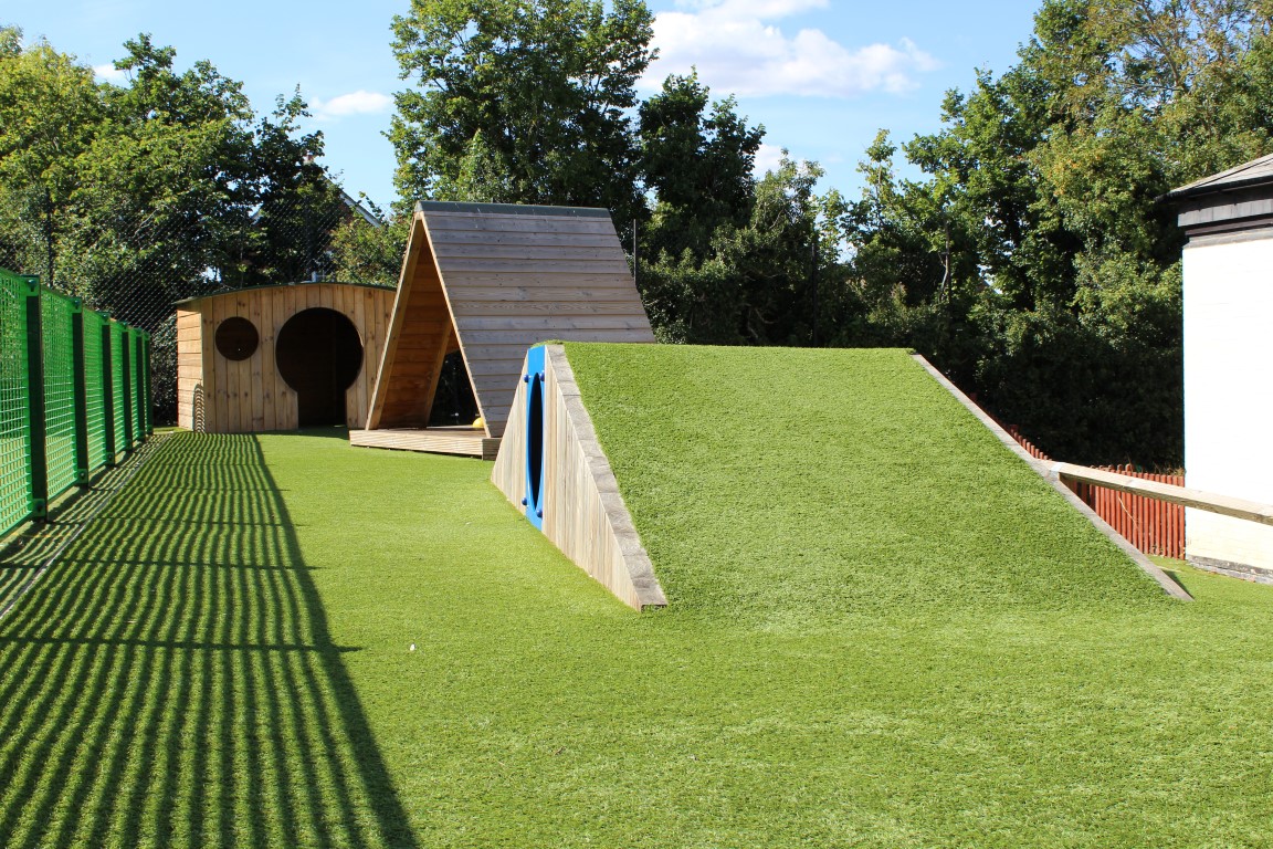 Artificial grass laid over a Mound and Tunnel and around the Timber playhouses pair nicely with the timbers and provide all-weather access to the scheme