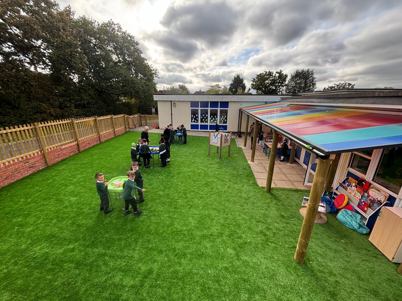 After: the newly opened space had artificial grass throughout, as well as a gorgeous rainbow-roof canopy to provide all-weather access to the outdoors, and a lovely sensory effect in the space.