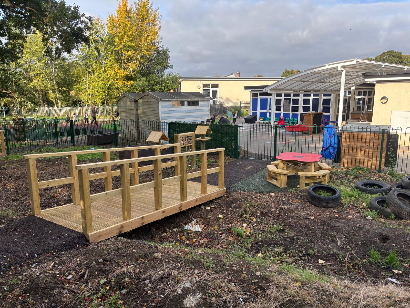 After: a bonded rubber mulch pathway links to three bridges that cross the gulley, with islands of surfacing with bug hotels, bird tables and tables for children to sit and work together in small groups.
